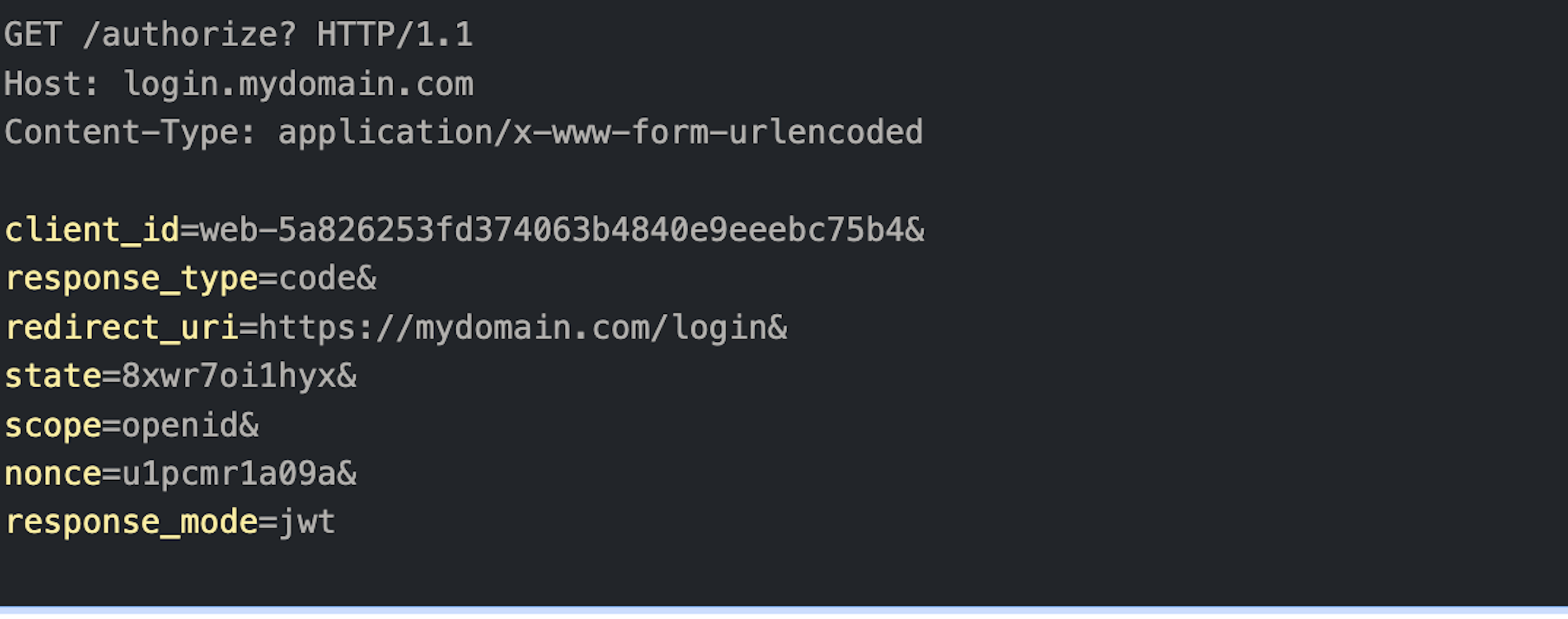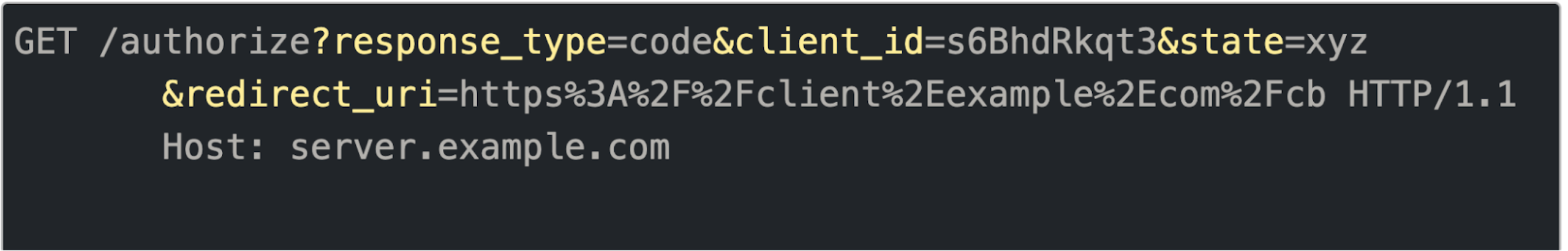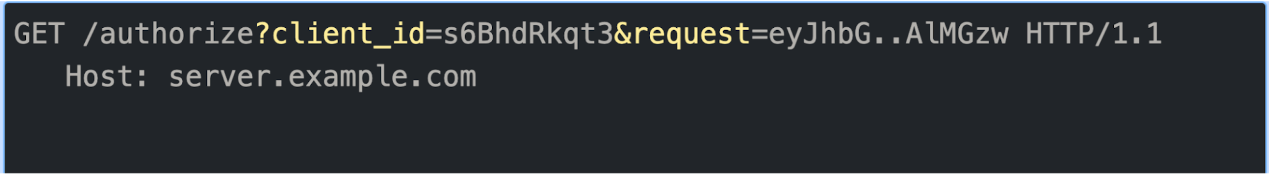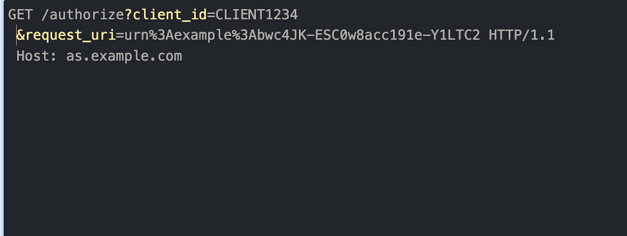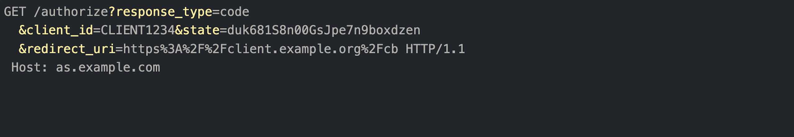 The following is an example of a typical authorization request where the request parameters are encoded as query string parameters (plain text).