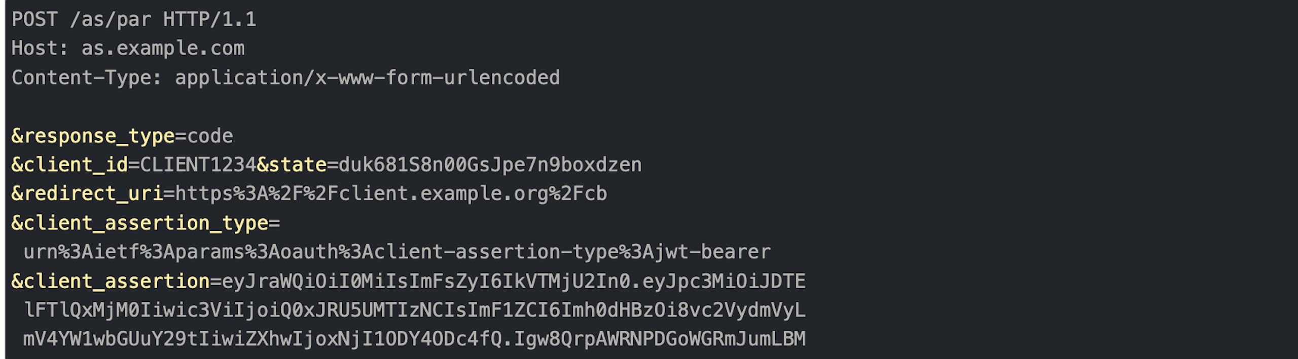 With PAR, the authorization request is pushed to the authorization server’s PAR endpoint instead of the authorize endpoint. The request is initiated as a POST. Client authentication is included as JWT client assertion-based authentication. This is the first call that registers the authorization request with the server. Malformed requests or unauthenticated requests can be rejected