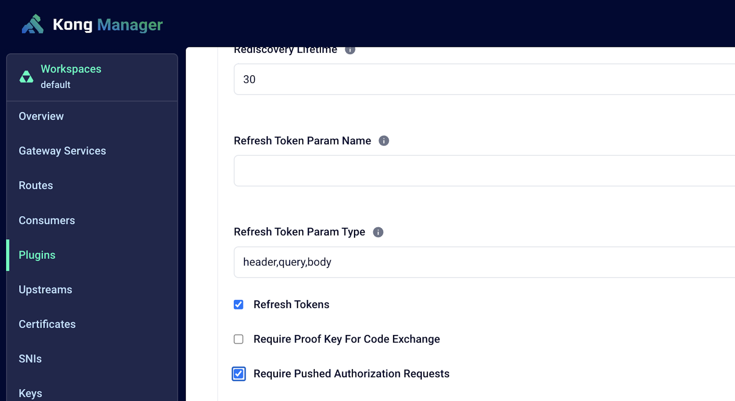 Kong’s OIDC plugin offers support for PAR via the Require Pushed Authorization Requests configuration option. If configured, the plugin first pre-registers the request when the authorization request is initiated. The authorization server’s PAR endpoint issues a request URI that represents the registered authorization request. It responds back with the ‘request_uri’ parameter, which is used in subsequent requests.