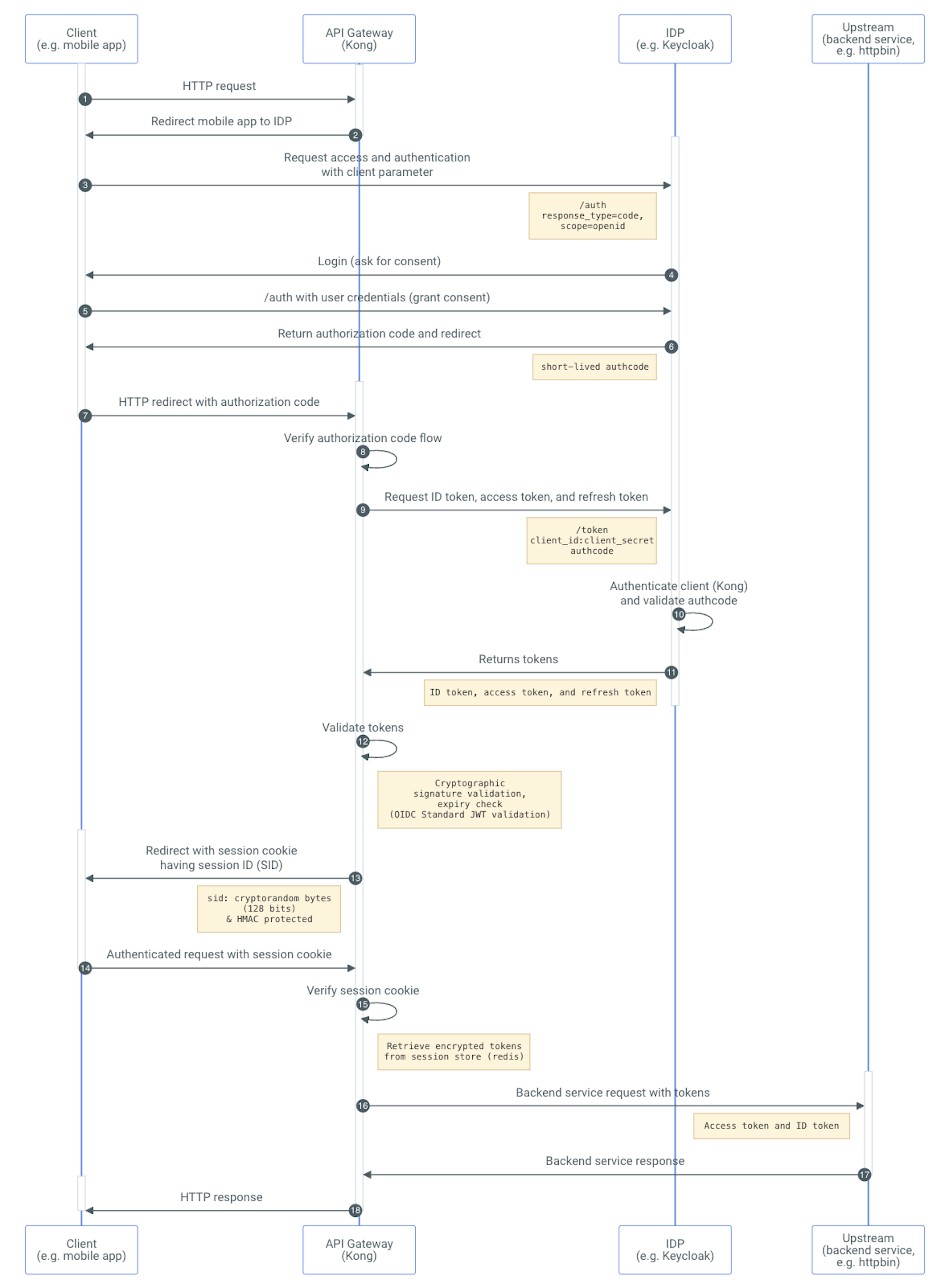 Kong’s OpenID Connect (OIDC) plugin provides the functionality. Under the hood, Kong orchestrates the exchange of the authorization code for an access token to authorize the application's access to resources with consent from the resource owner as shown above.