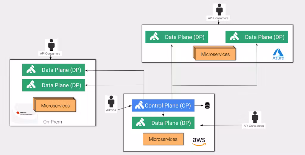 In this context, the control plane (CP) is responsible for administration tasks, while the data plane (DP) is exclusively used by API consumers. Again, in a hybrid deployment, the control plane and data planes run in completely separate environments.