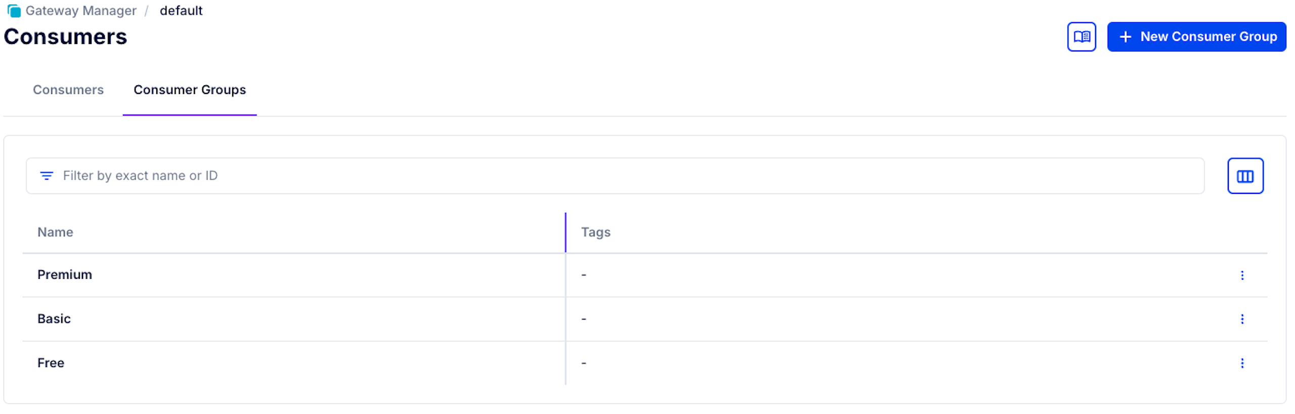 A useful component of Konnect is Consumer groups. Consumer groups provide the ability to organize consumers within an API ecosystem. By grouping consumers, you eliminate the need to manage them individually, providing a scalable, efficient approach to managing configurations. We can also scope policies (plugins in the Konnect world) to Consumer Groups. To achieve our use case, we will create three different Consumer groups, free, basic, and premium. These will represent the different tiers we outlined in the previous section.