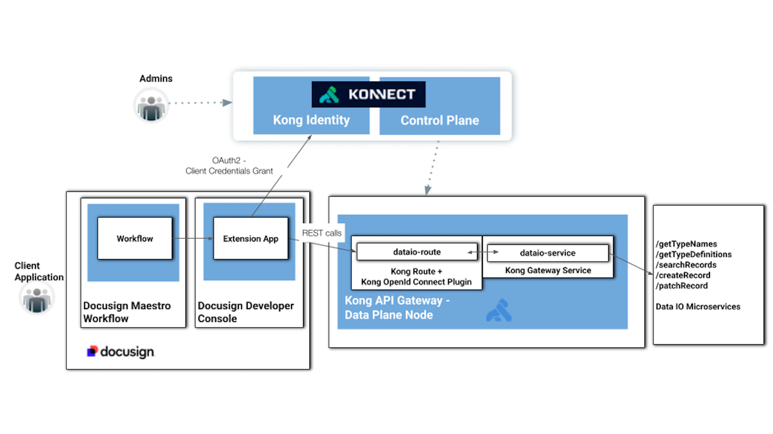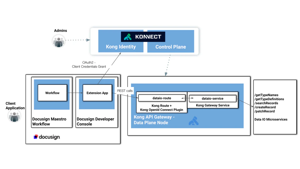 **Kong Identity:** Responsible for implementing OAuth based authentication flows with Docusign Extension Apps and Kong API Gateway.