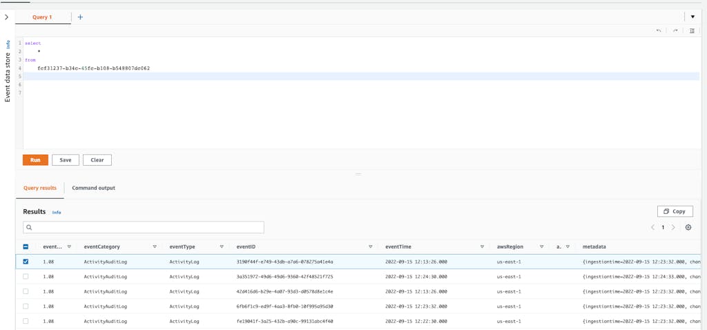 With the infrastructure validated, the lambda function will be triggered hourly by CloudWatch. Once the lambda function has been triggered, logs should be present in the CloudTrail event store. In order to view the logs, in the AWS console navigate to CloudTrail → Lake and in the Editor Tab you can query the logs in the event data store.What data are we submitting to CloudTrail Lake ?
