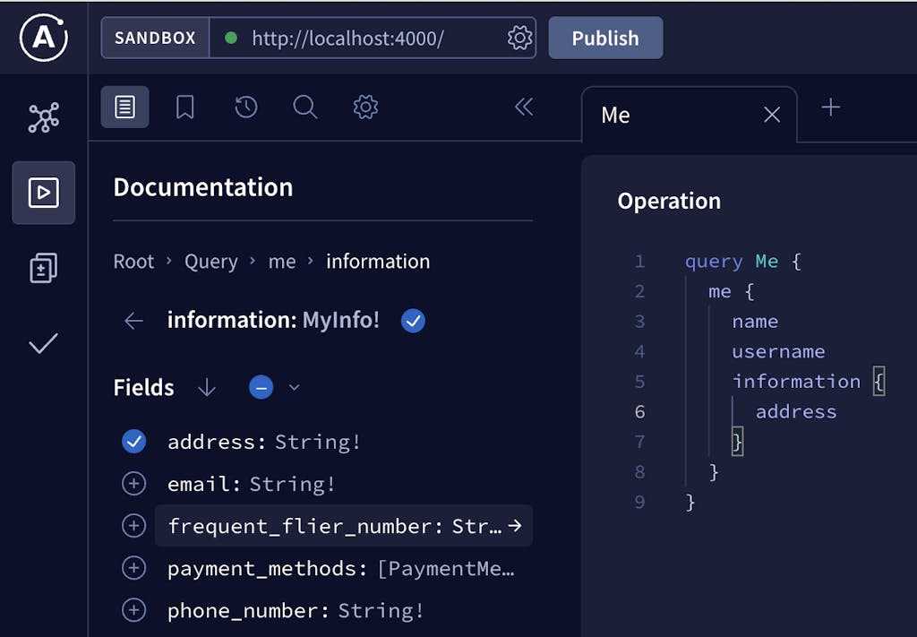 In development mode, the Apollo SDK provides an embedded GraphQL IDE called the Apollo Sandbox. To use the sandbox with the server running, open your browser to http://localhost:4000 and you should see an interactive interface to build GraphQL queries.