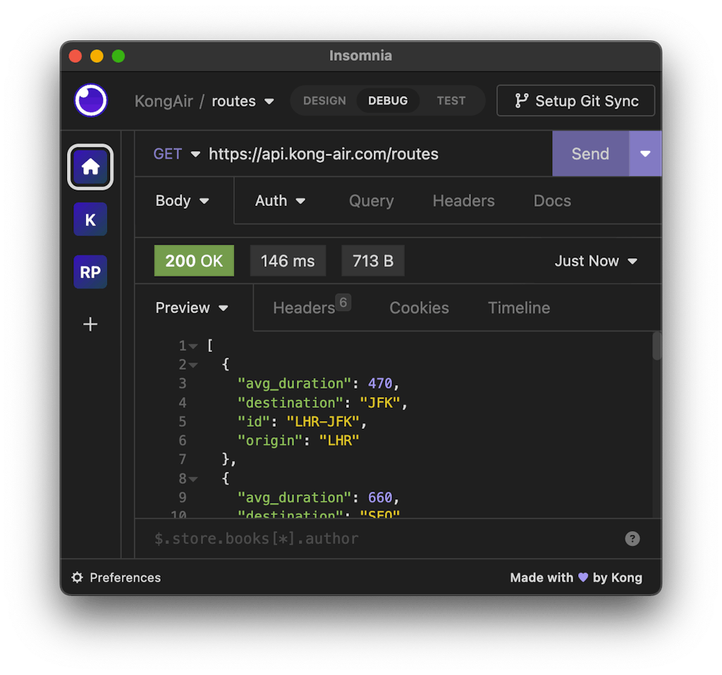 The APIs are also hosted at api.kong-air.com, which means we can test the APIs with an API development tool like Kong Insomnia.