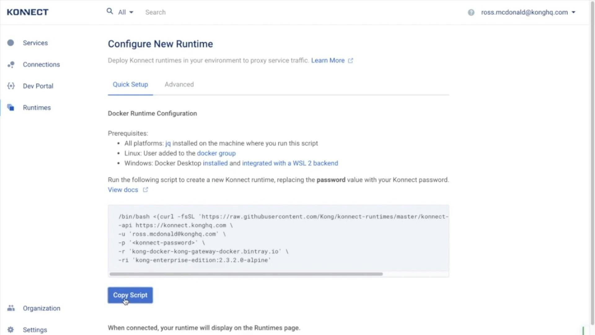 Konnect currently supports quickstart instructions for all major operating systems and cloud providers. Feel free to choose the one that best fits your needs but I'll choose the Mac OS docker script option. For this option, click Generate Script and you will be presented with a complete script that you can copy and paste into your terminal to create a local Runtime Instance and automatically connect it to your Konnect Runtime Group.