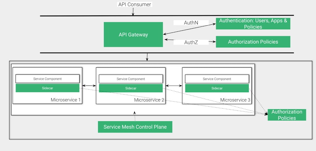 - Authorization Server: responsible for enforcing specific policies to make sure the Consumer can access the resources sitting behind the Gateway (microservices, applications, etc.). The Authorization Server also enforces access control policies related to microservice-to-microservice communication inside the Service Mesh.