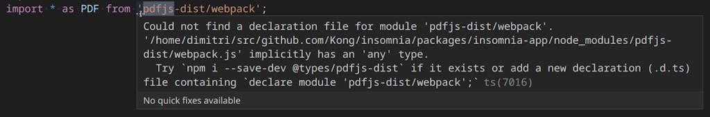 At the time it looked like the trouble might be over, but in the end for better or for worse, PDF.js was always a problem for the Insomnia app (even after we brought it in as a direct dependency). We definitely had bugs related to it that affected users. But the worst part was probably the difficulty it posed to day-to-day development.