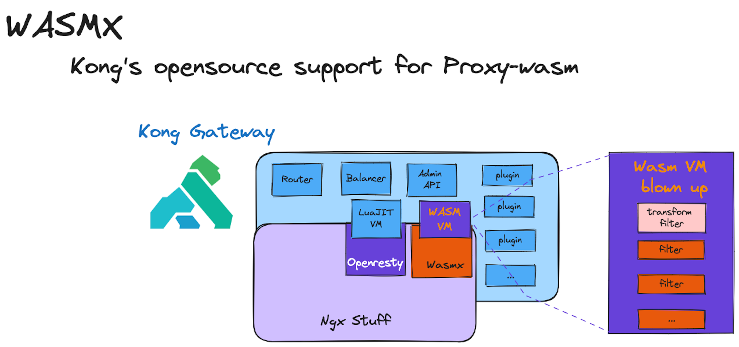 In order to also provide support for Proxy-Wasm, the Kong engineering team built an ngx_wasm module that implements the Proxy-Wasm specification and sits, metaphorically speaking, alongside the LuaJIT VM.