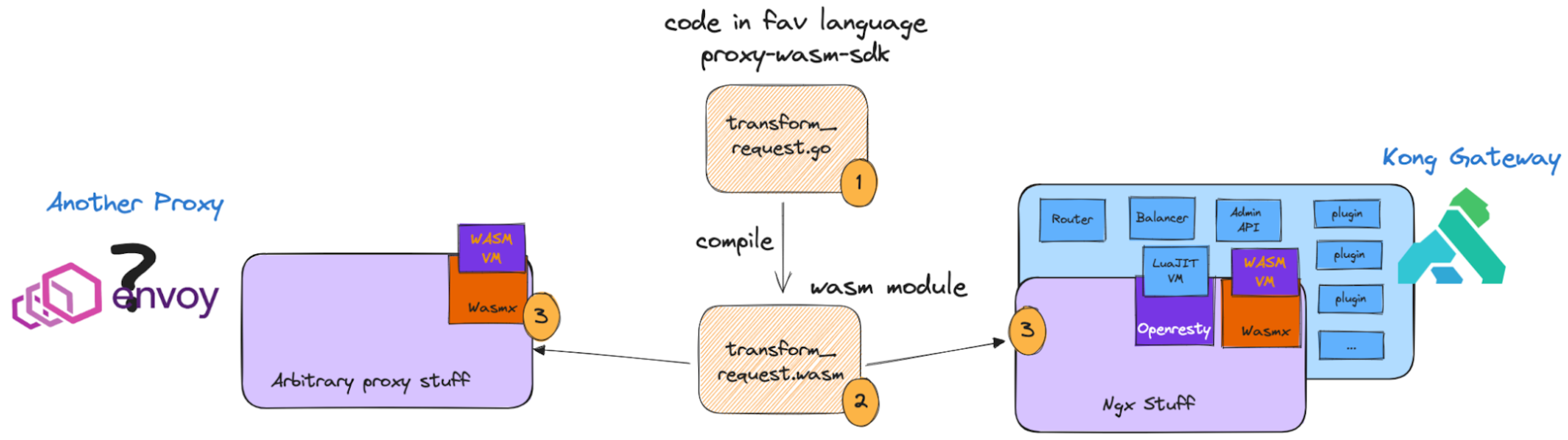 2. Write once, run everywhere. Theoretically, a Proxy-Wasm filter that works on Kong Gateway will work on Envoy, and vice versa with no code changes. In fact, this was proven during the Kong Builders episode A Practical Application of WebAssembly + Kong Gateway.