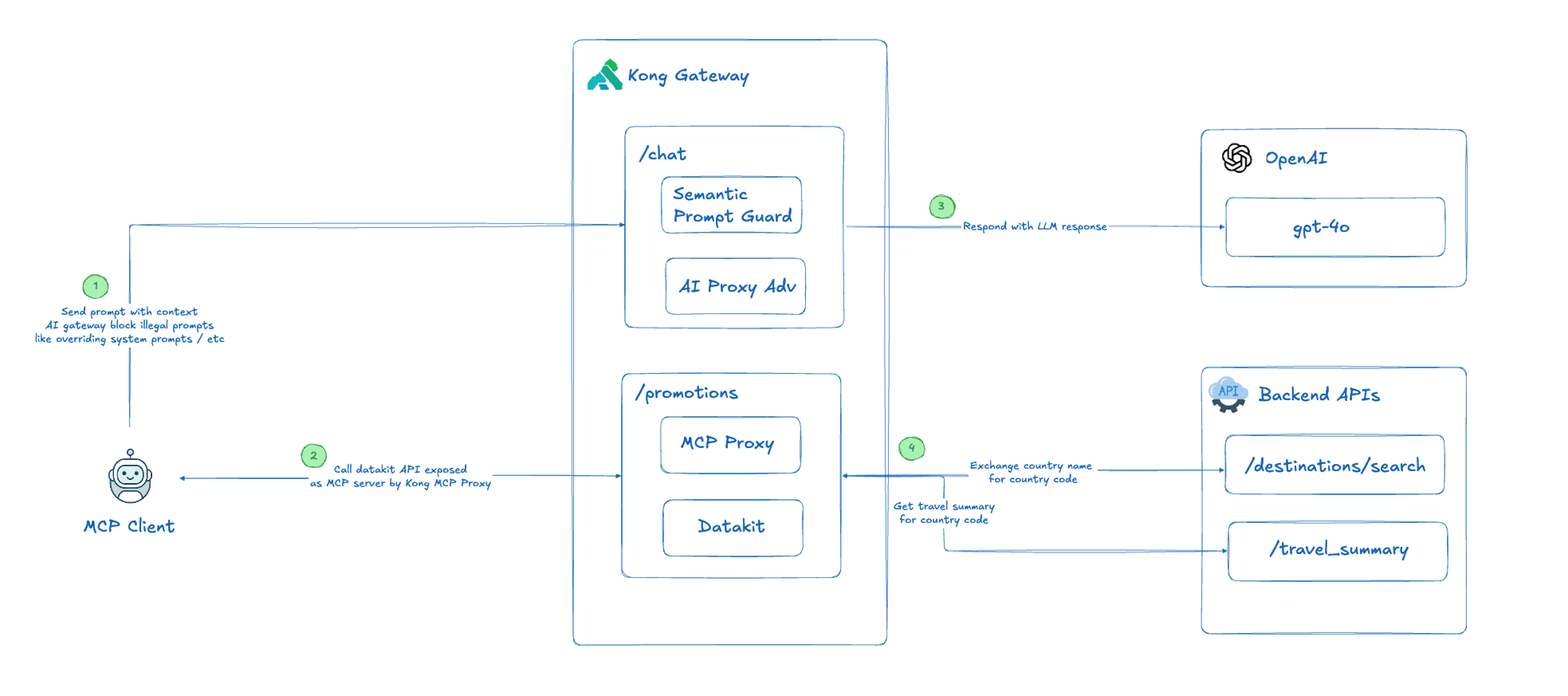 OpenAI function calling is a mechanism for the model to request data, but it often requires direct connectivity to your APIs. Model Context Protocol (MCP) is a standardized interface that decouples the model from the backend. When combined with DataKit and Kong, MCP ensures the model only interacts with a sanitized, governed "view" of your data, rather than raw API endpoints.