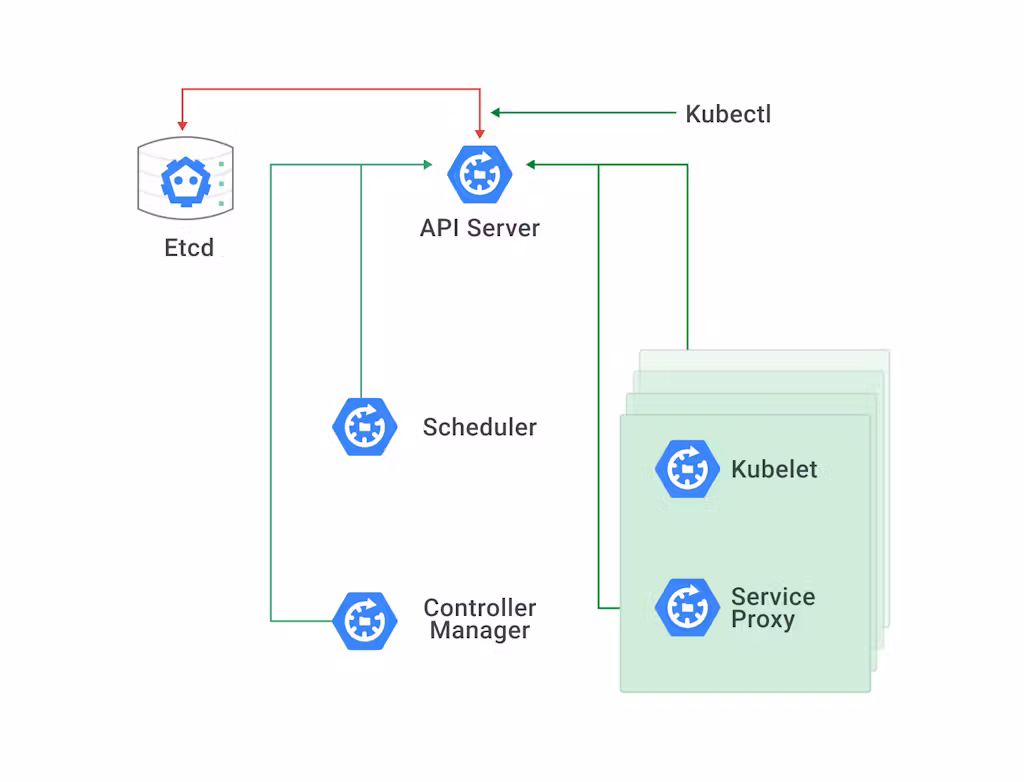The manager runs an API server, scheduler, a controller and a key-value store (etcd) to keep the state of the cluster. Kubernetes exposes an API via the API server so that you can communicate with the API using a local client called kubectl. The scheduler sees the requests for running containers coming from the API and finds a suitable node to run that container in.