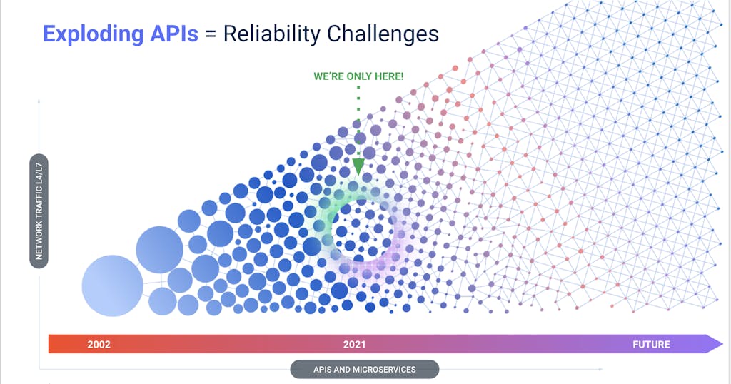 However, as we decompose the monolith into microservices, we go from a handful of in-app connections to an exponentially increasing number of microservices all talking to each other over various networks. We've gone from big, centralized systems to very chatty, distributed services; i.e. a considerable increase in network traffic.