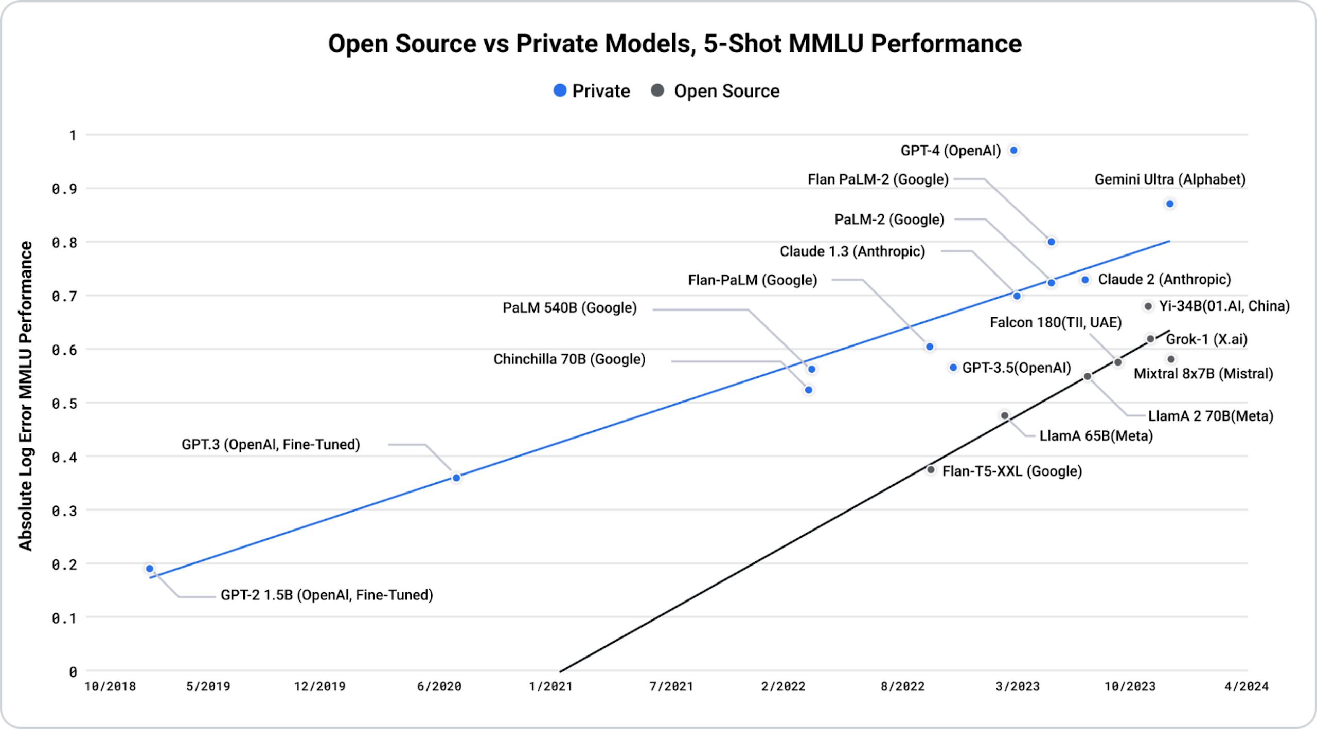 Open source models are rapidly improving and even surpassing some private models. Source: ARK Invest