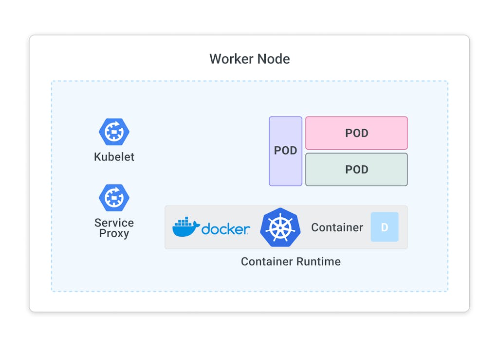 Each node in the cluster runs two processes: a kubelet and a service proxy. The kubelet receives requests to run the containers and watches over them on the local node. The proxy creates and manages networking rules to expose the container to the network.