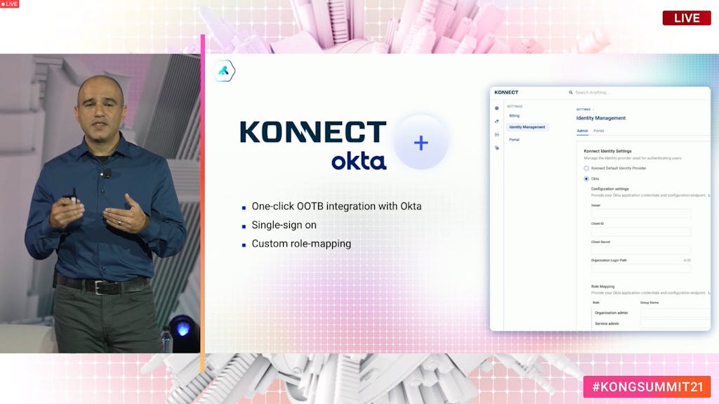 Lastly, Reza announced Okta support for Konnect Cloud users. This includes single sign-on, custom role-mapping and one-click integration with Okta.
