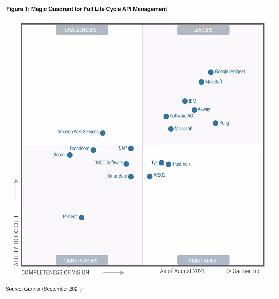 Gartner Magic Quadrants provide insights, in-depth analyses and actionable advice about the market's direction and its key players. The 2021 Gartner Magic Quadrant for Full Lifecycle API Management uses a two-dimensional matrix that evaluates API vendors like Kong, based on their Completeness of Vision and Ability to Execute.