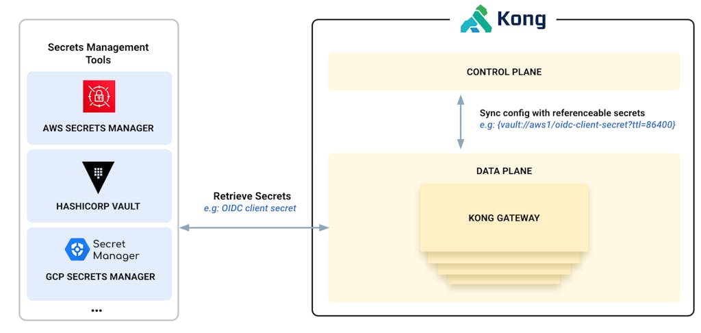 It's no accident that Kong Gateway boasts a wide set of integrations with secrets management tools. This allows a user to pass a reference for a value in their gateway config, which will later be dereferenced by the chosen secrets manager integration. Practically speaking, this means you don't have to put sensitive information into your Kong Gateway config. This fulfills the enterprise compliance goal of not requiring the Kong operator to handle sensitive information, but still providing Kong Gateway the required information to operate as your API gateway.