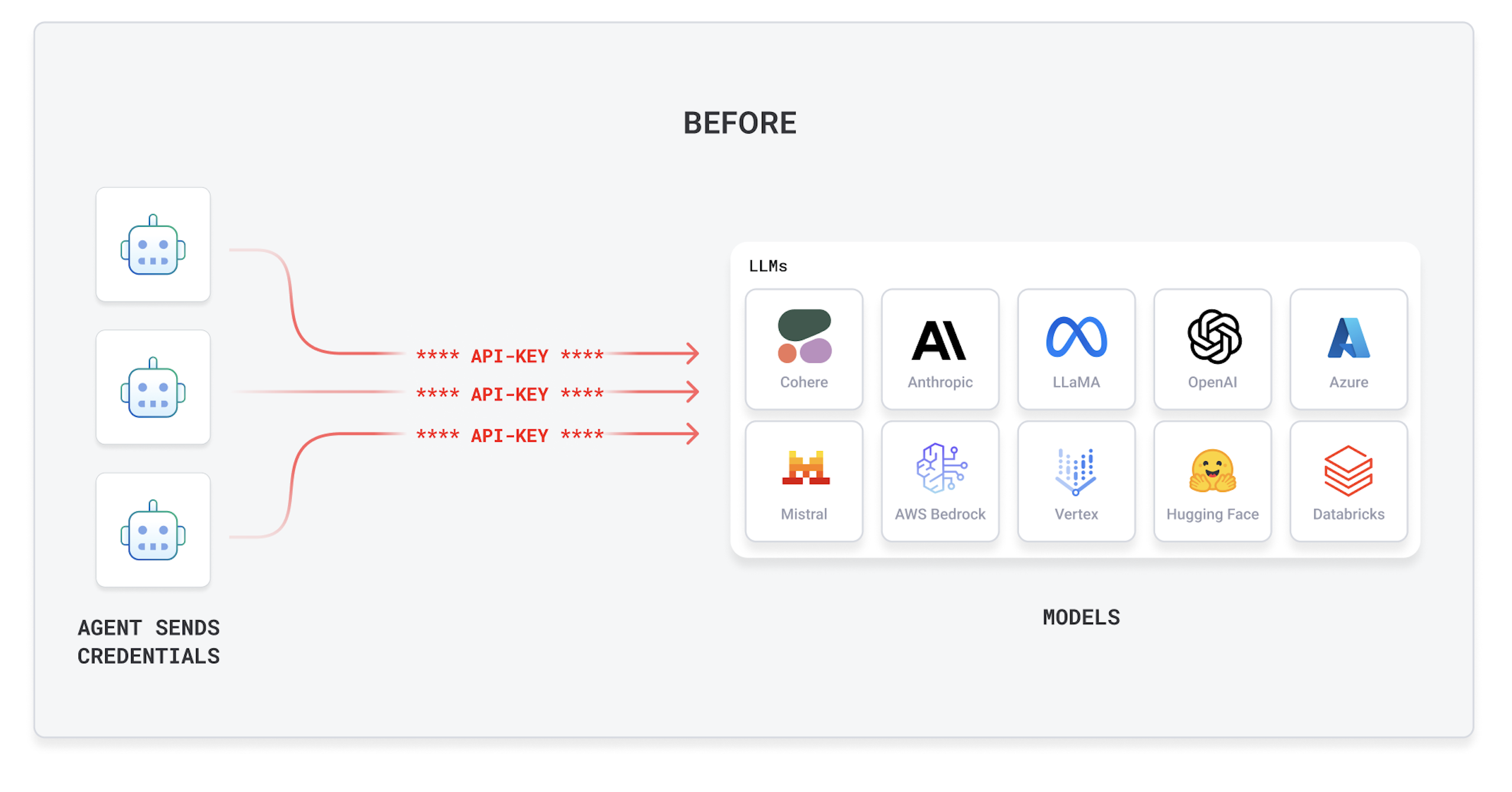 If you're a builder, you likely keep sending your LLM credentials on every request from your agents and applications. But if you operate in an enterprise environment, you'll want to store your credentials in a secure third-party like HashiCorp Vault or IDP provider and have the infrastructure inject the credentials for you dynamically. By doing so, you'll have: