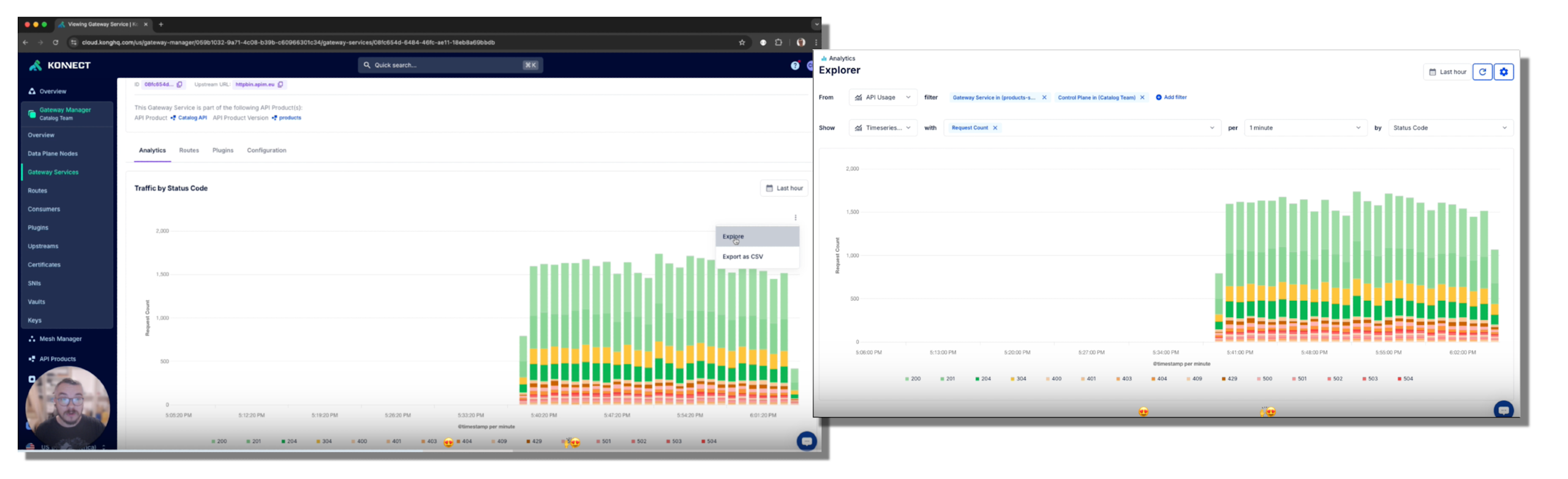 Since the analytics experience is well-embedded in Gateway Manager, Dev Portal, and Service Catalog, you automatically get high-level visualizations and charts of relevant API metrics in real time across the Konnect platform. To enhance the troubleshooting flow from these various parts of Konnect, we’ve improved the ability to explore these charts in deeper detail.