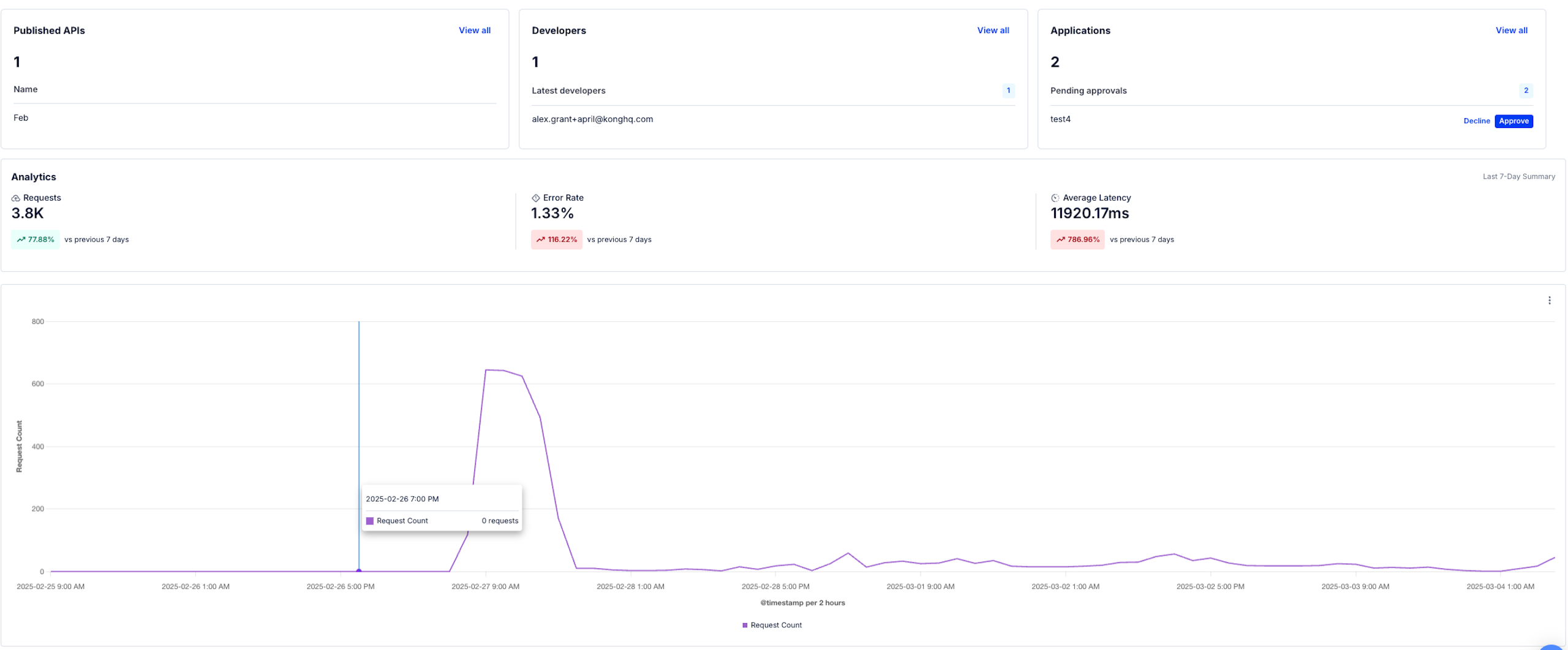 After publishing their API to a portal(s), owners/producers can evaluate and enhance their API’s usability and performance by leveraging key metrics accessible from the built-in Analytics dashboard in Konnect Dev Portal.