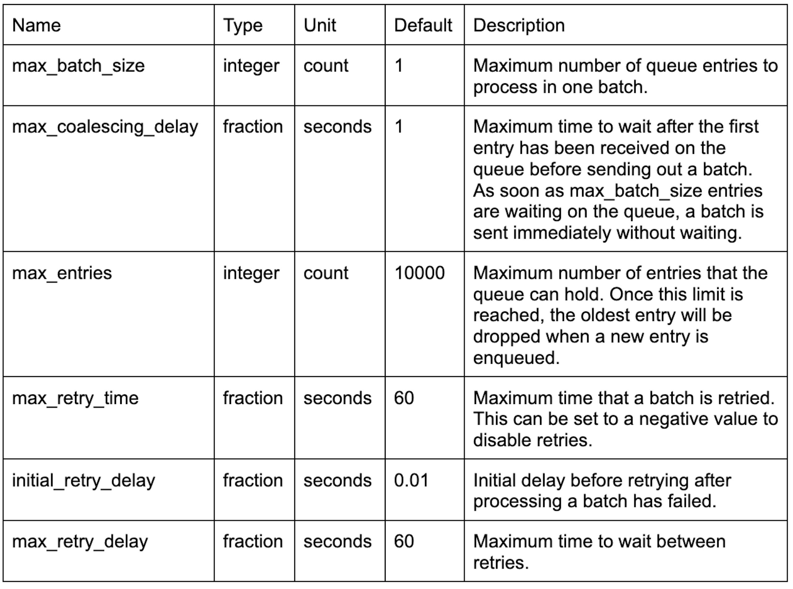 The batching behavior of queues is controlled by the max_batch_size and max_coalescing_delay parameters. max_batch_size defines the maximum number of entries that can be put into one batch. It must be small enough so that the resulting chunk of data can actually be handled by the upstream server. It is important to assess this parameter carefully as, depending on how max_coalescing_delay is set, the actual batches sent under normal operating conditions can be much smaller. Only in abnormal situations the number of entries will be reaching max_batch_size. Inadequate configuration and testing of this parameter may lead to amplified issues during high load scenarios.
