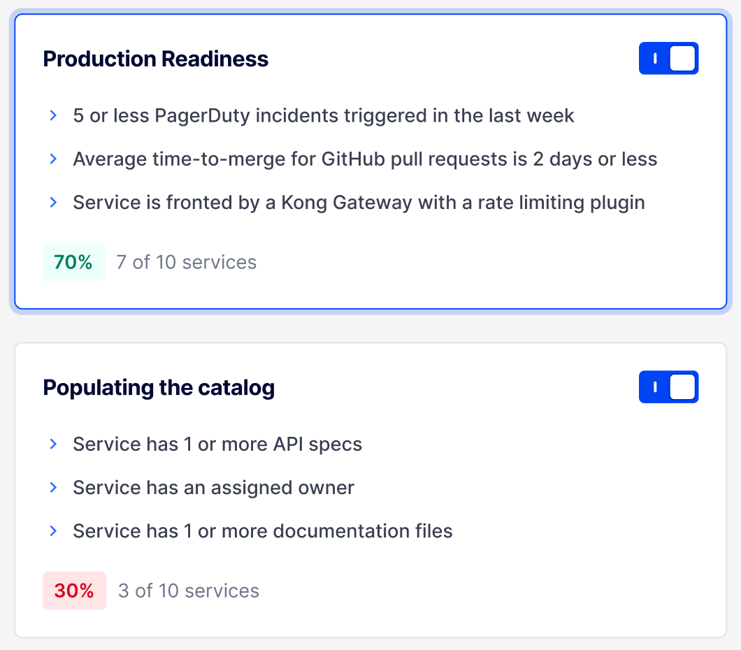 Ensuring that all teams across an organization adhere to the company’s maturity standards and industry-defined best practices can be challenging initiatives to drive for Platform Teams, especially those who work at large enterprises. These initiatives typically involve kicking off huge cross-functional processes spanning multiple teams, each with its own cultures, timelines, and priorities. Given both its breadth and depth of understanding of an organization’s service ecosystem, Service Catalog is well-positioned to solve this problem for Platform Teams.