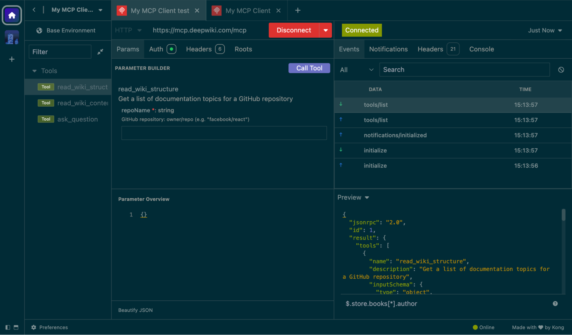 Why should you care? One broken MCP interaction can cascade through an entire agentic workflow, creating failures that are difficult to reproduce and expensive to fix. Insomnia’s MCP Client gives you the tools to catch these problems before they hit production. When Kong Konnect instantly transforms your APIs into MCP servers, Insomnia completes the workflow by ensuring these servers are product-ready and thoroughly tested.