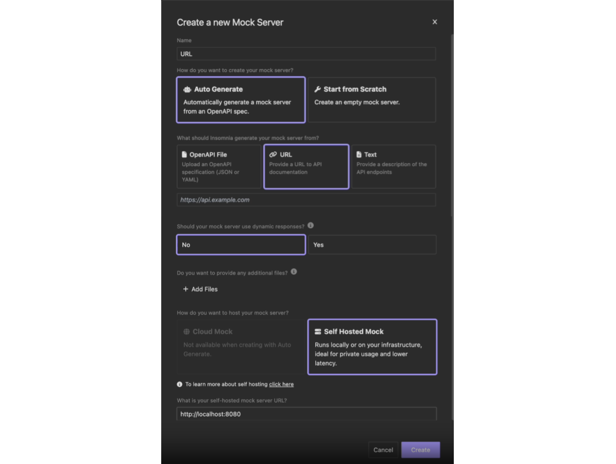 Instead of spending hours manually configuring mock servers, provide a simple description of what you need, a URL, JSON Blob, or OpenAPI Spec, and Insomnia will automatically generate a complete mock server. Building a new feature while the backend API is only half-complete? Describe the expected behavior and start developing immediately instead of waiting. Need to test against a metered public API like Stripe or Twilio without burning through your usage limits? Generate a mock that replicates the exact scenarios you need. The possibilities are endless.