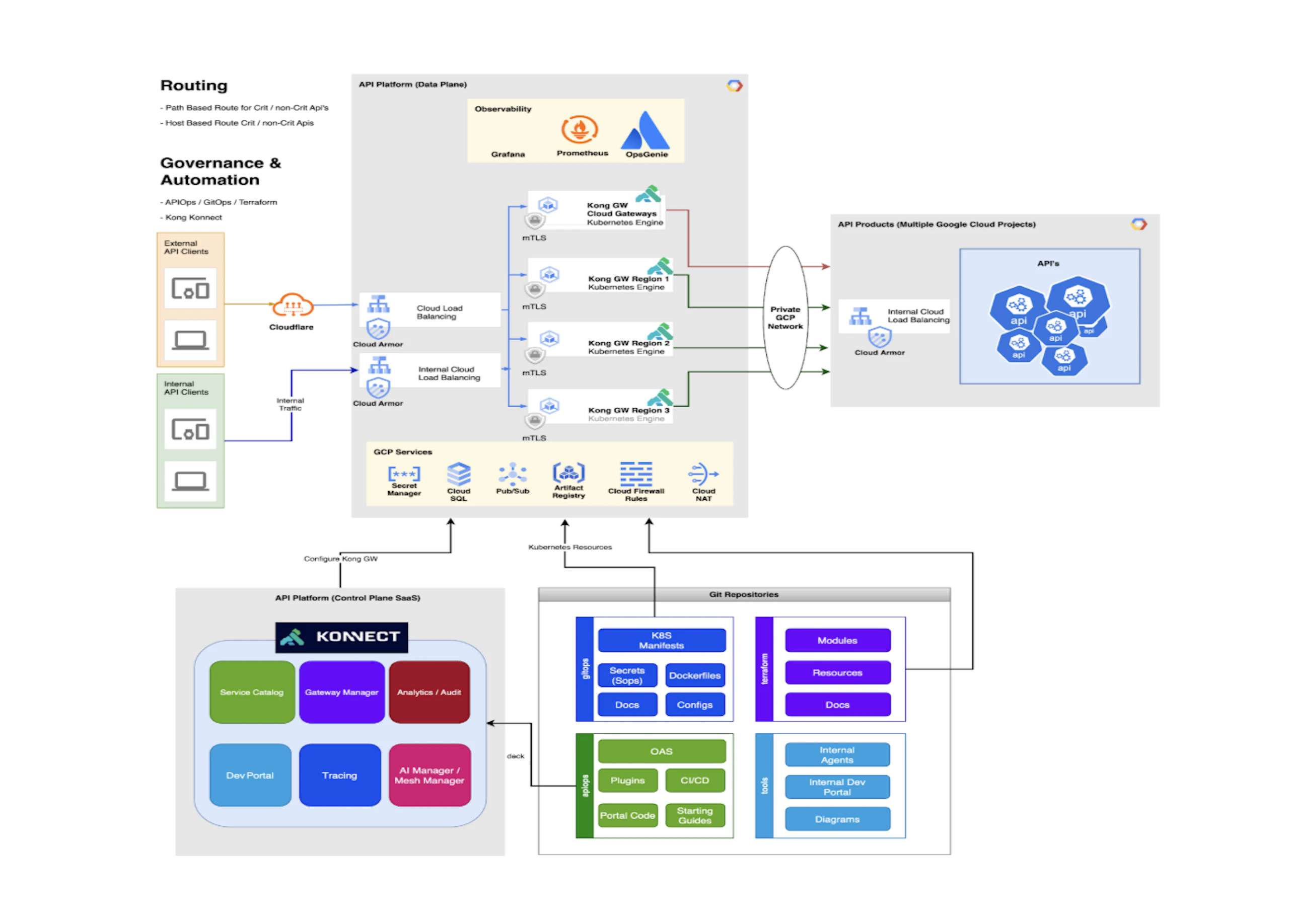 The technical architecture deployed 410 APIs across three Google Cloud regions. External APIs route through Cloudflare while internal APIs use private Google load balancers. Critically, federated nodes process internal Kubernetes cluster traffic directly without hitting the central gateway, dramatically improving performance and cost efficiency.