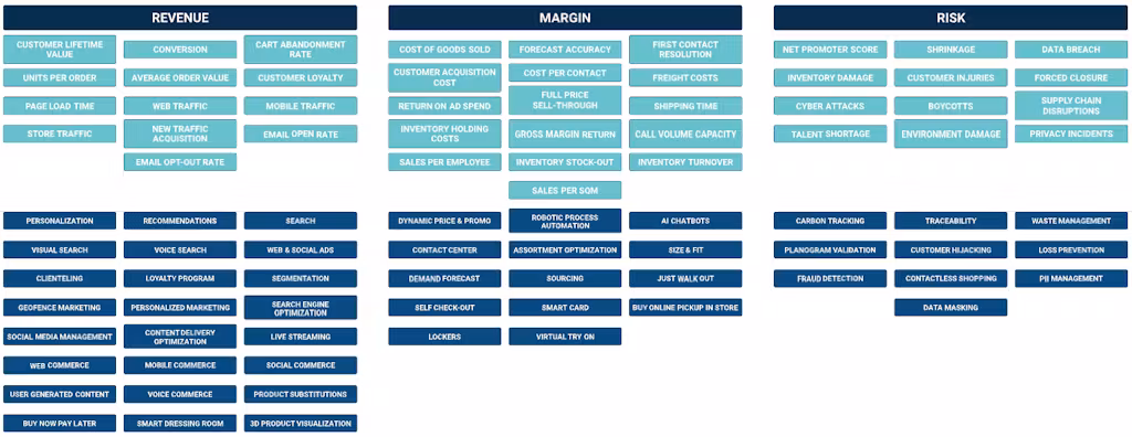 Performance in each one of those buckets is tracked via KPIs and KPIs are influenced by the implementation of use cases. Continuing with our example, Figure 6 shows some of the most important KPIs (light blue) and use cases (dark blue) in the retail industry, organized around revenue, margin, and risks.