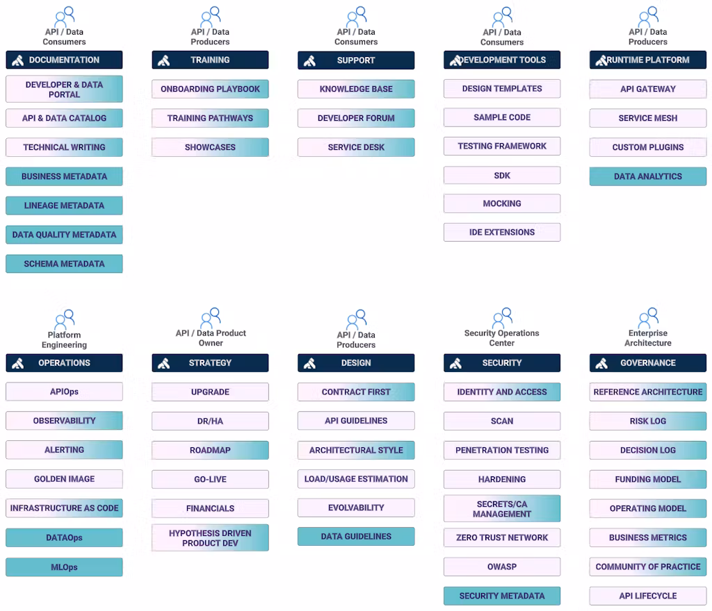 An API platform will benefit from capabilities with a pink background. A data platform will benefit from capabilities with a green background. But both initiatives will benefit from capabilities with a pink/green background.