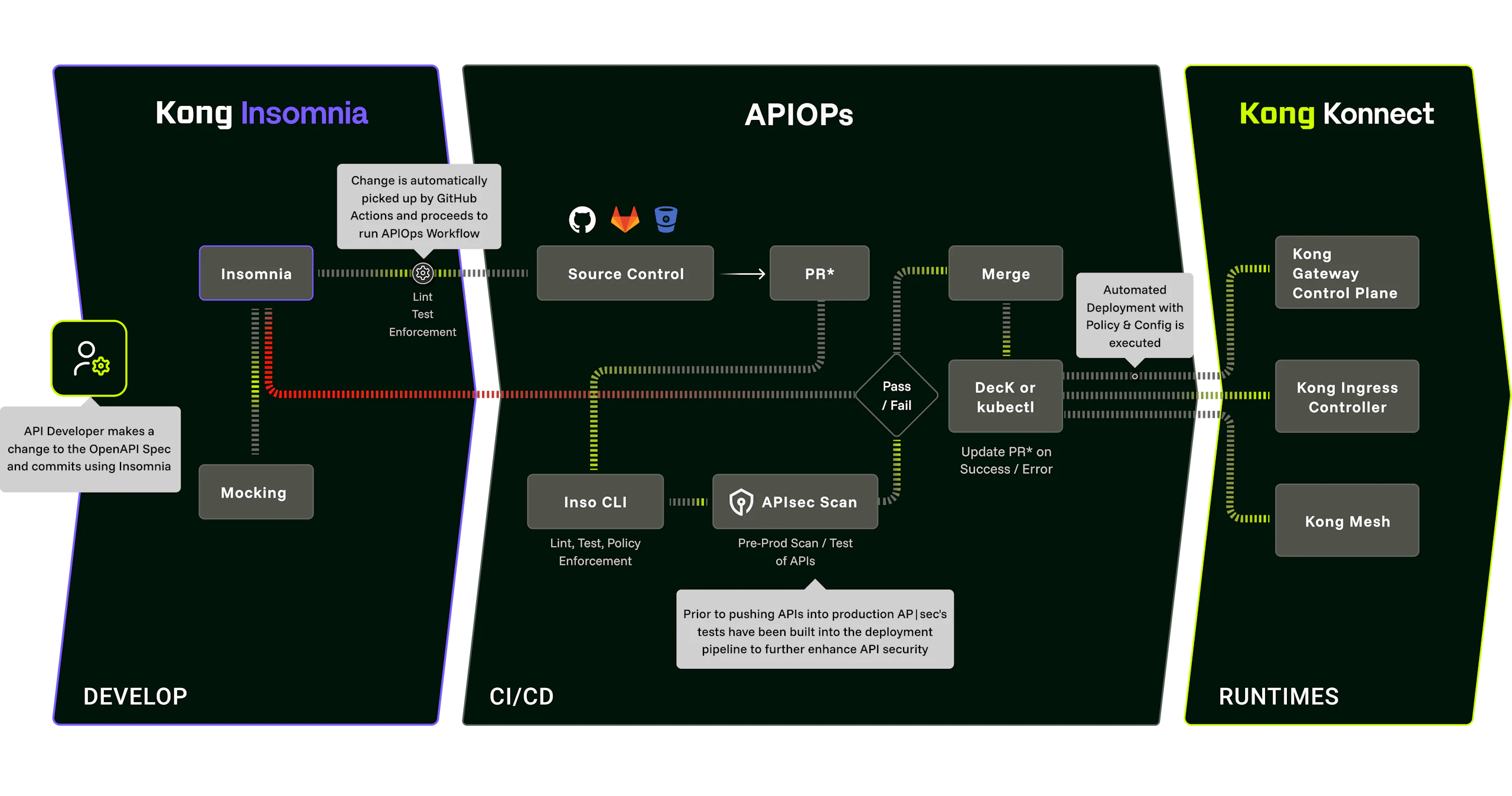 Automate guardrails with the industry-leading APIOps and automation solution from Kong. Enforce best practices through automated, full-lifecycle governance with our Admin API, Kubernetes Operator, or decK declarative CLI tool.