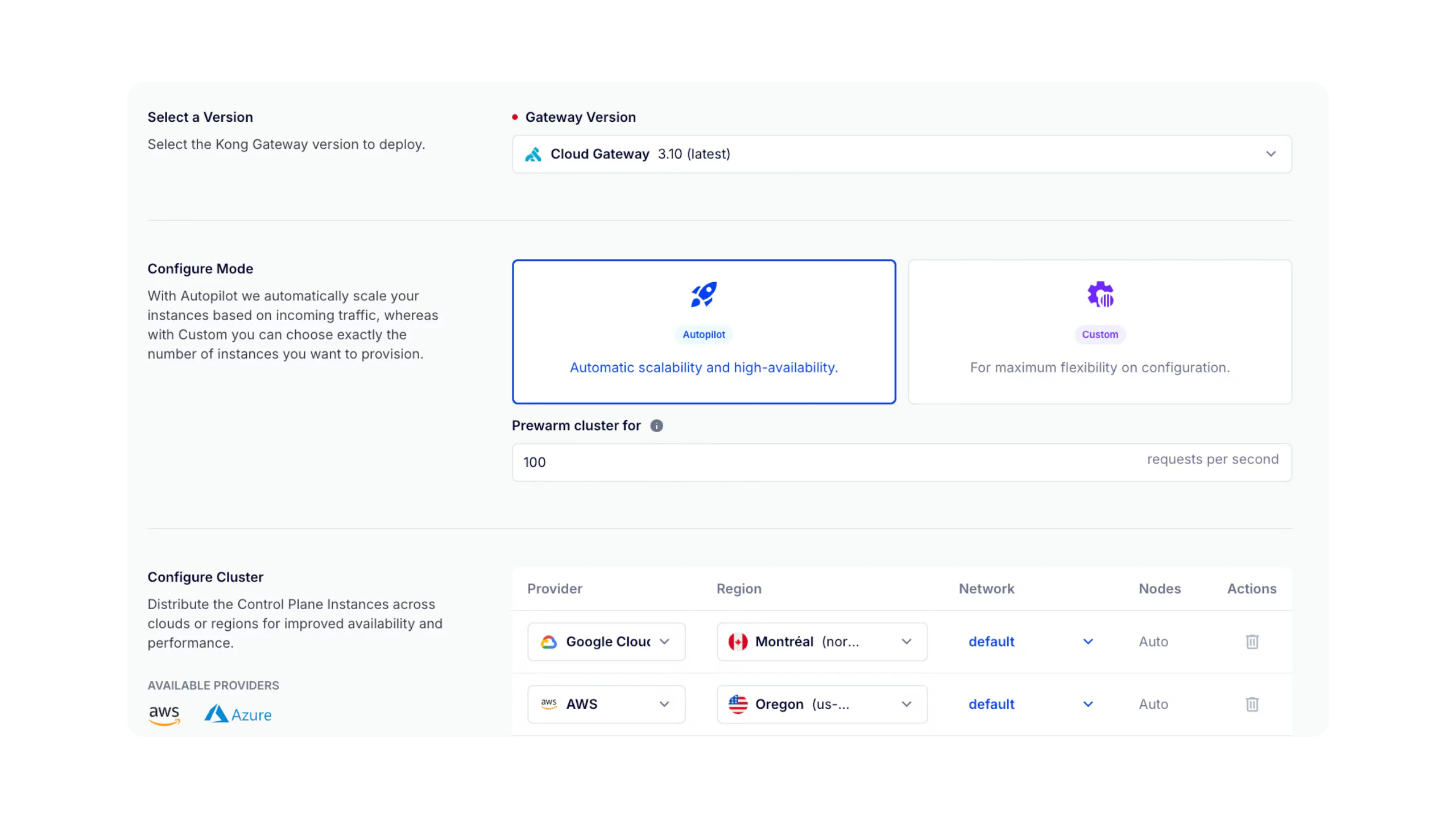• Use Kong-managed AI and API gateways, but choose the cloud provider and region where you want us to host them.