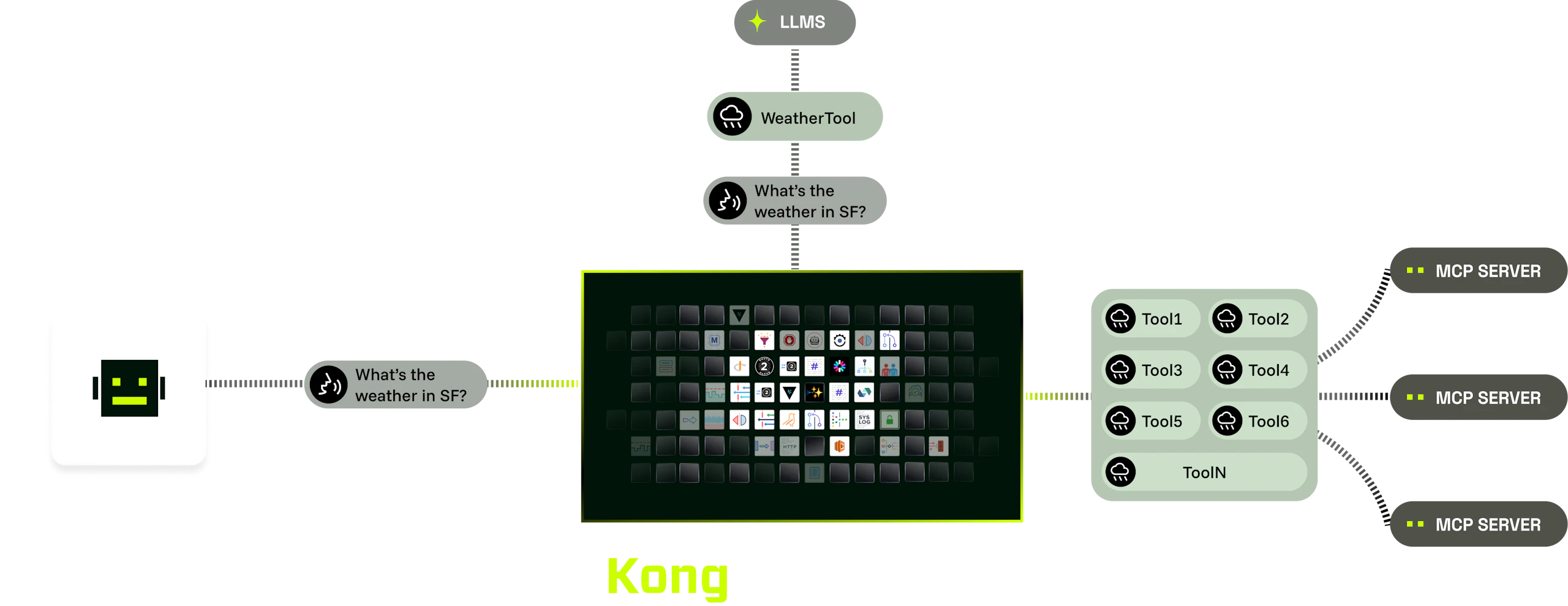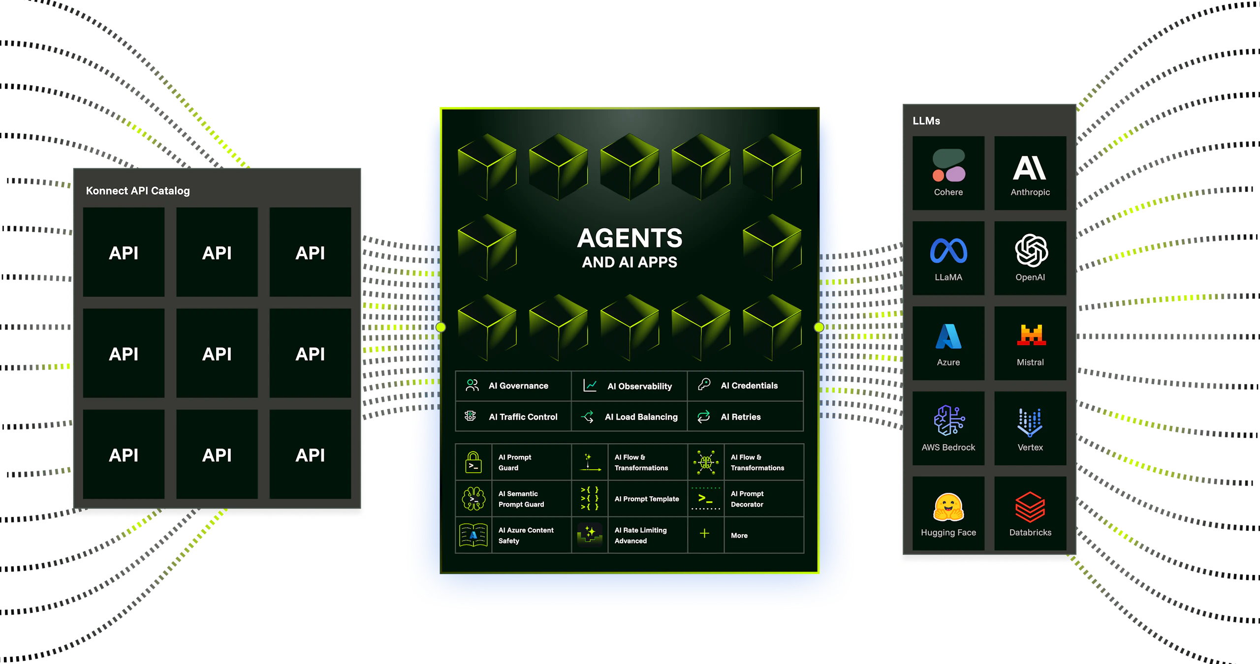 AI agents need to access different LLMs for specific use cases. Kong AI Gateway provides a universal API interface to simplify agent interaction with diverse LLMs and AI providers.