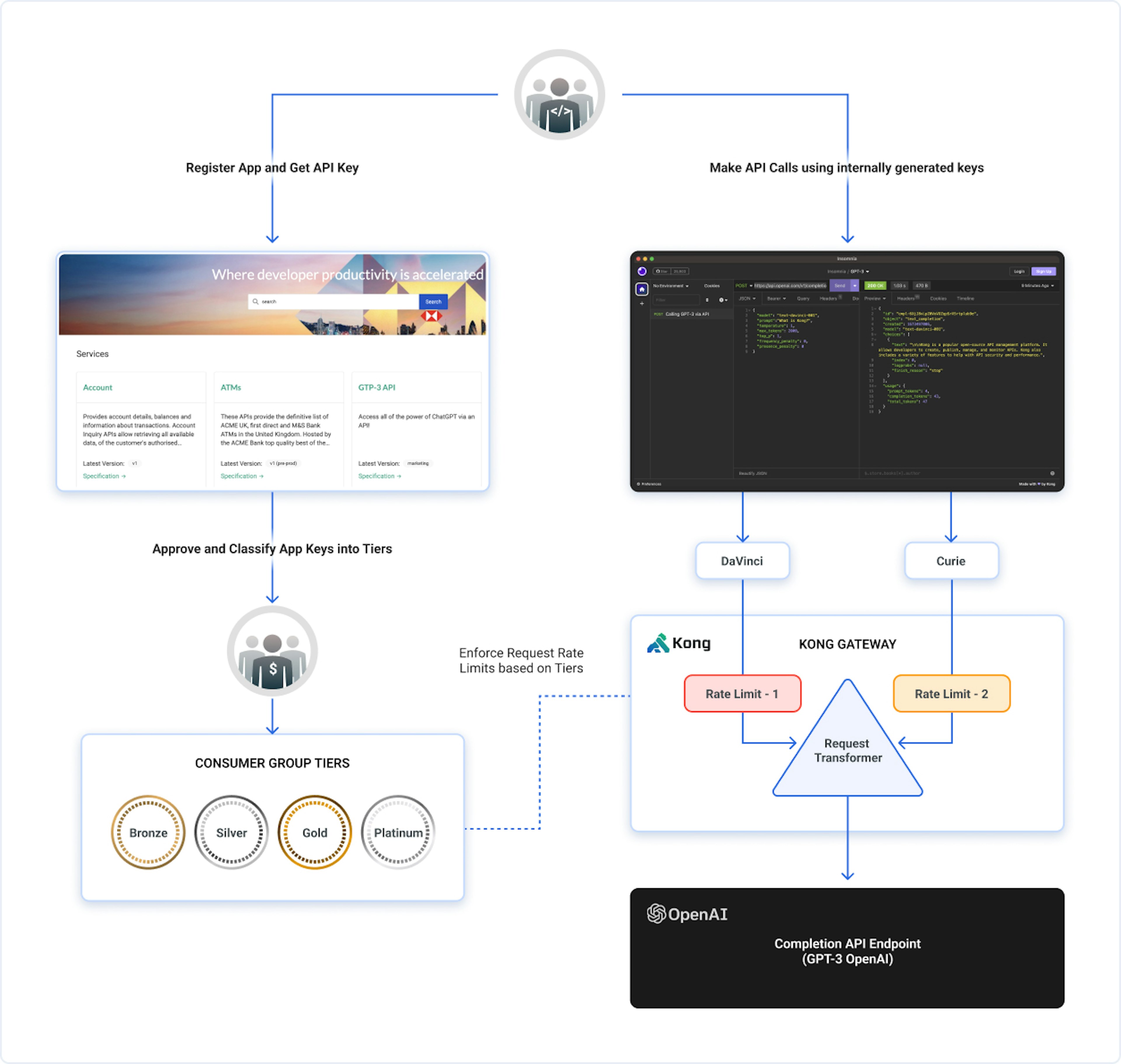 Instead of issuing each developer an API Key, a consuming organization can opt to manage the submission of API keys to OpenAI by relying on internal authorization - perhaps via OIDC - to limit what services and models a developer may use. In the diagram below, Kong proxies two AI models to consumers, the Davinci and the Curie models. The developers are limited to which model they may use based on their permissions.